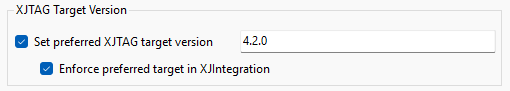Any projects with this feature enabled will require XJTAG software version 4.2.0 or later. Once enabled, a specific target version (e.g. 4.2.0), or a family of releases (e.g. 4.2) may be specified. If a family is specified then any minor releases within that major release will be considered a match, allowing the use of bug-fix releases if necessary. This restriction may be optionally applied to XJIntegration through an additional “Enforce preferred target in XJIntegration” check box. If this is enabled then XJIntegration will be prevented from opening the XJPack file, unless the target versions match.